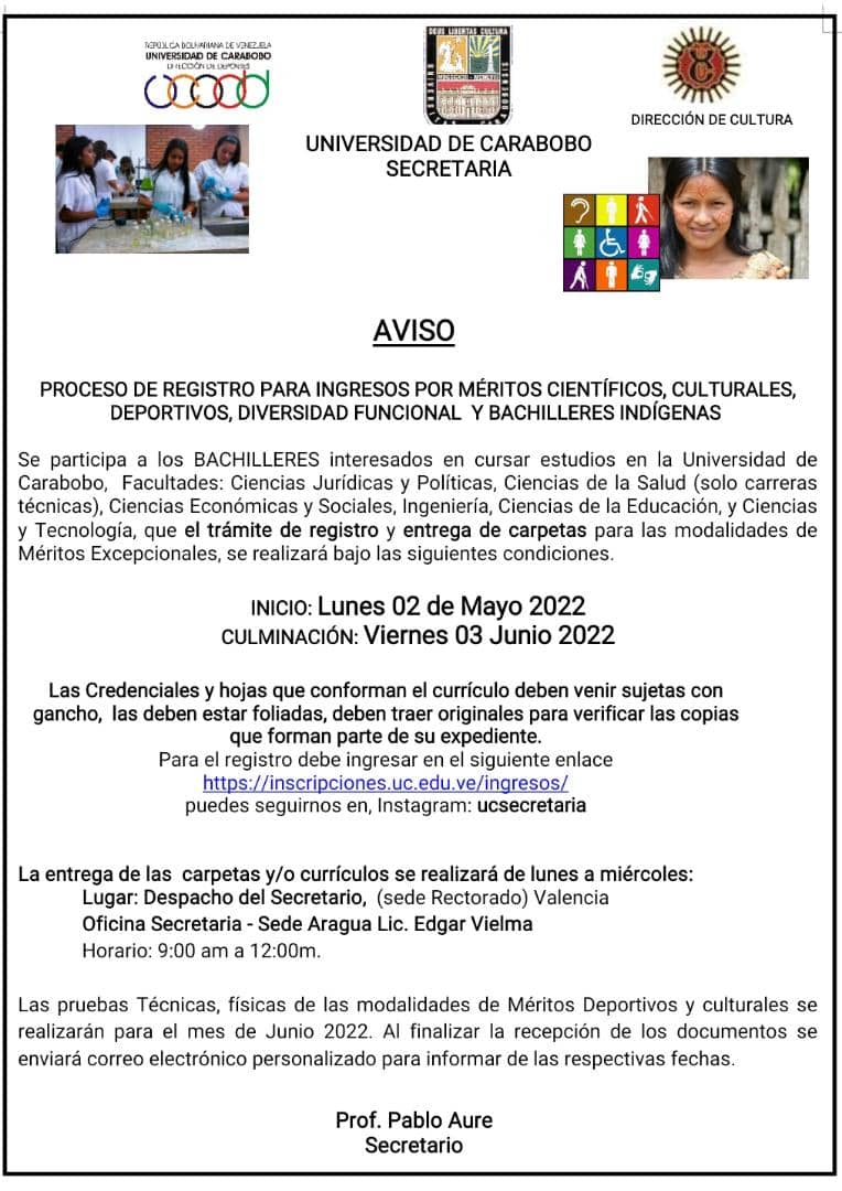 La Universidad de Carabobo dio inicio el pasado 02 de mayo al proceso de registro para el ingreso por méritos científicos, culturales, deportivos, diversidad funcional y bachilleres indígenas, el cual estará vigente hasta el 03 de junio del presente año.