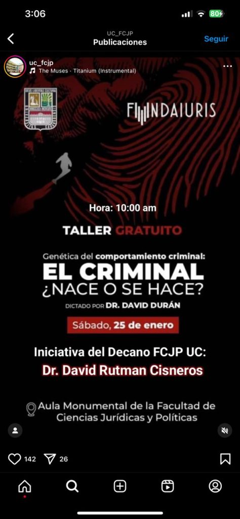 En los espacios del Aula Monumental de la Facultad de Ciencias Jurídicas y Políticas se realizará el próximo sábado 25 de enero el Taller Gratuito “Genética del comportamiento criminal: El criminal ¡nace o se hace?” La ponencia será dictada por el Dr. David Durán y forma parte de las actividades organizadas en la Facultad en […]