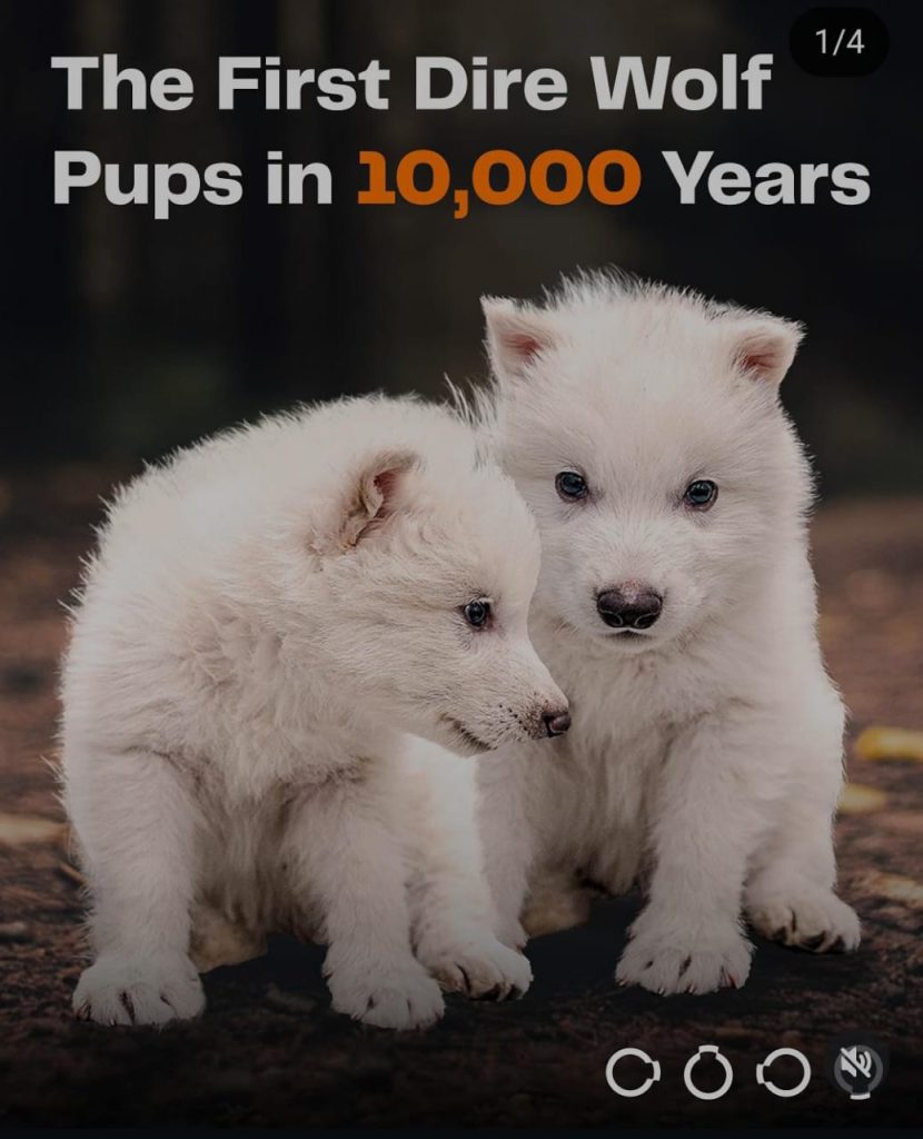 "Nuestros cachorros de lobo terrible, Rómulo y Remo, nacieron el 1 de octubre de 2024, fueron rescatados de la extinción mediante modificaciones genéticas derivadas de un genoma completo de lobo terrible, reconstruido meticulosamente a partir de ADN antiguo encontrado en fósiles que datan de hace 11 500 y 72 000 años", expresó la empresa en sus redes sociales.