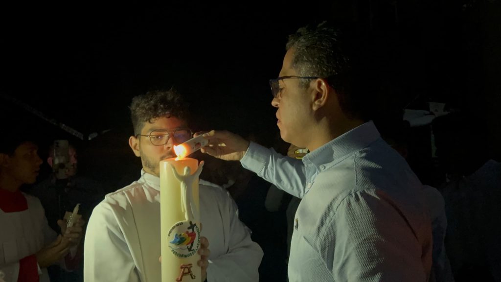 Al iniciar la celebración fuera del templo, el presbítero Joel Núñez bendijo el fuego del cirio pascual que fue encendido por el alcalde León Jurado Laurentín, quien, en compañía de los feligreses, caminó al interior de la iglesia. Los creyentes también encendieron sus velas para salir de la oscuridad como un acto de purificación para honrar el sacrificio de Jesucristo.