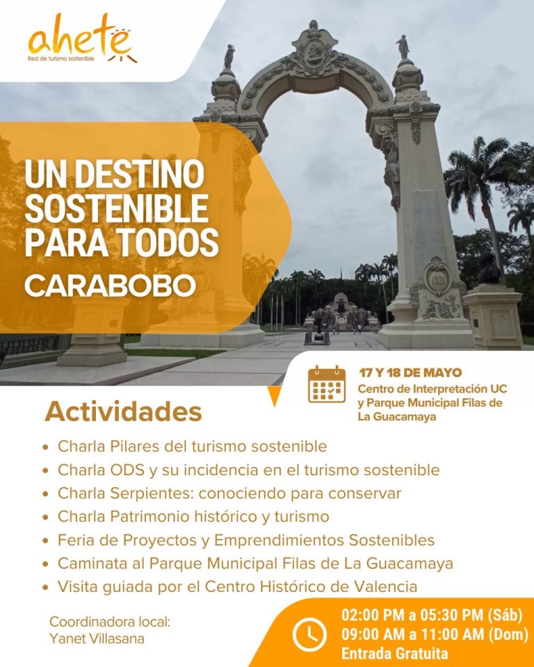 La Red de Turismo Sostenible de Venezuela – AHETE, a través de la Coordinación del Ecosistema Regional Carabobo, invita a toda la ciudadanía a participar en el evento “Carabobo – Un destino sostenible para todos”, una jornada educativa, cultural y comunitaria que se realizará los días sábado 17 y domingo 18 de mayo de 2025 en la ciudad de Valencia, estado Carabobo. Este evento lo realizamos con el apoyo de la Fundación para el Fomento y Desarrollo de Obras y Actividades Turísticas y Recreacionales (FUNDATUR).