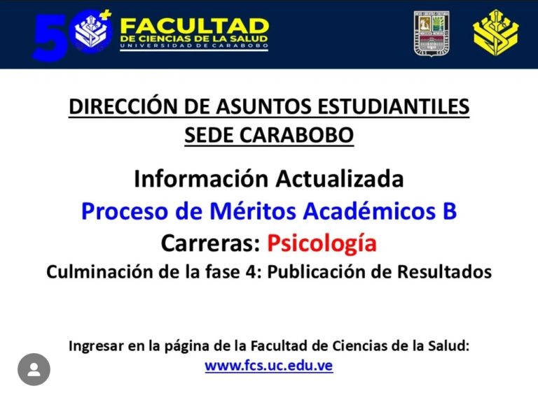 La Facultad de Ciencias de la Salud de la Universidad de Carabobo, publicó a través de su cuenta de Instagram @fcs_uc que está disponible el proceso de Méritos Académicos B para la carrera “Psicología”.