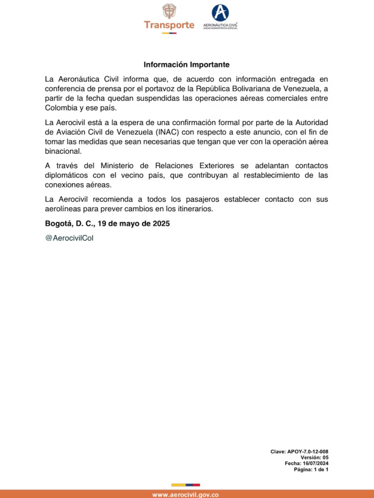 Las operaciones aéreas comerciales entre Colombia y Venezuela fueron suspendidas de manera inmediata desde este lunes, con una medida que fue confirmada por la Aeronáutica Civil de Colombia (Aerocivil) tras la notificación por parte de las autoridades venezolanas.