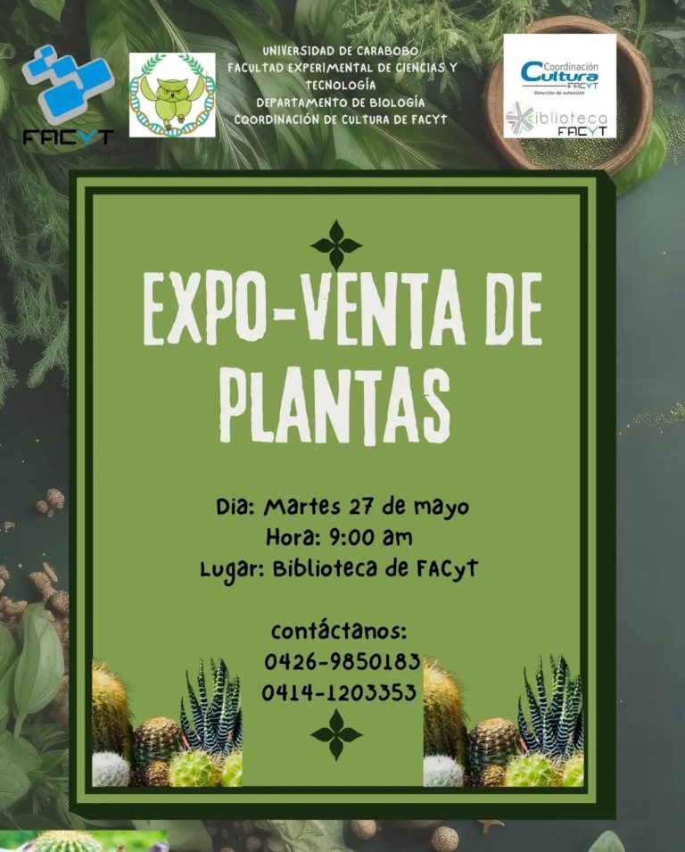En la Biblioteca de la Facultad de Ciencias y Tecnología de la Universidad de Carabobo (Facyt) hoy martes 27 de mayo se realizará el evento denominado “Expo-Venta de Plantas”.