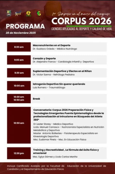 El próximo 28 de noviembre se realizará el 1er Simposio CORPUS 2026: Ciencias Aplicadas al Deporte y Calidad de Vida, en el auditorio de la Facultad de Ciencias de la Educación de la Universidad de Carabobo (FACEUC) La jornada comenzará a las 8:30 a.m. y contará con la participación de especialistas en medicina, nutrición y deporte.