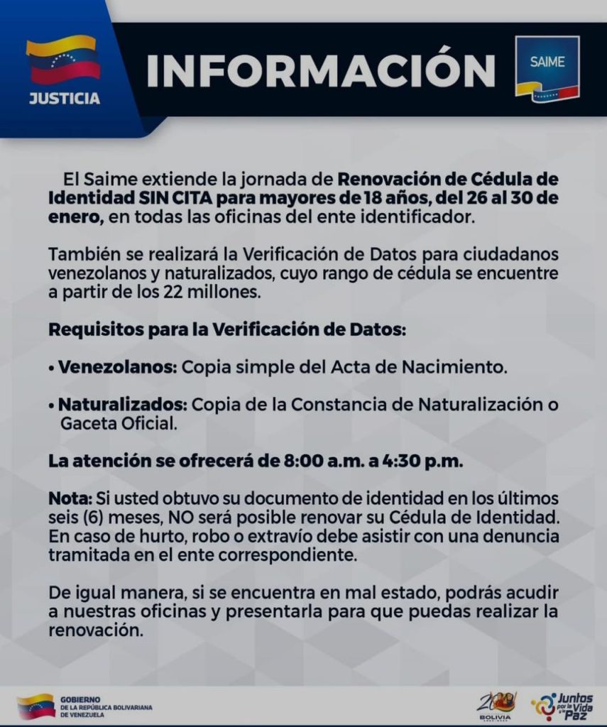 El Servicio Administrativo de Identificación, Migración y Extranjería (Saime) confirmó a través de sus canales oficiales la extensión del operativo especial para la renovación de la cédula de identidad, el cual se mantendrá vigente durante una semana adicional.