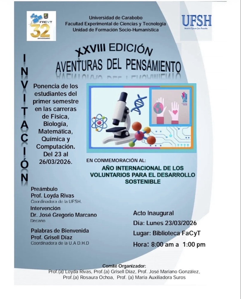 En el marco de la celebración de su 32º Aniversario, la Facultad Experimental de Ciencias y Tecnología (FaCyT) de la Universidad de Carabobo, a través de la Unidad de Formación Socio-Humanística (UFSH), invita a la comunidad universitaria a la XXVIII Edición de «Aventuras del Pensamiento». Este evento académico de larga trayectoria destaca el ingenio y […]