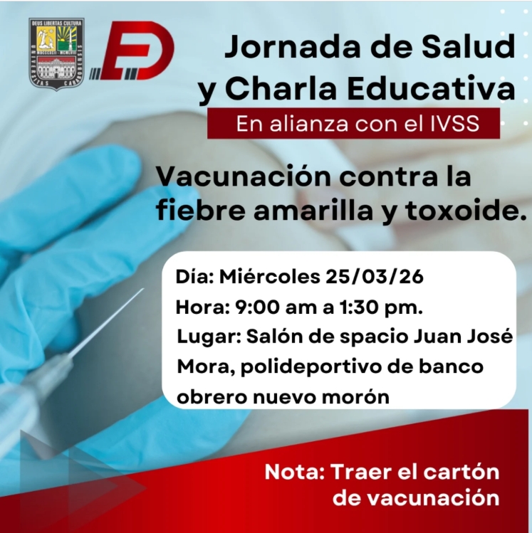 En el marco de su compromiso inquebrantable con el bienestar social, la Dirección de Extensión y Servicio Comunitario (DESCO) de la Universidad de Carabobo, en una alianza estratégica con el Instituto Venezolano de los Seguros Sociales (IVSS), anuncian la realización de una Jornada de Salud y Charla Educativa dirigida a toda la comunidad de Morón.