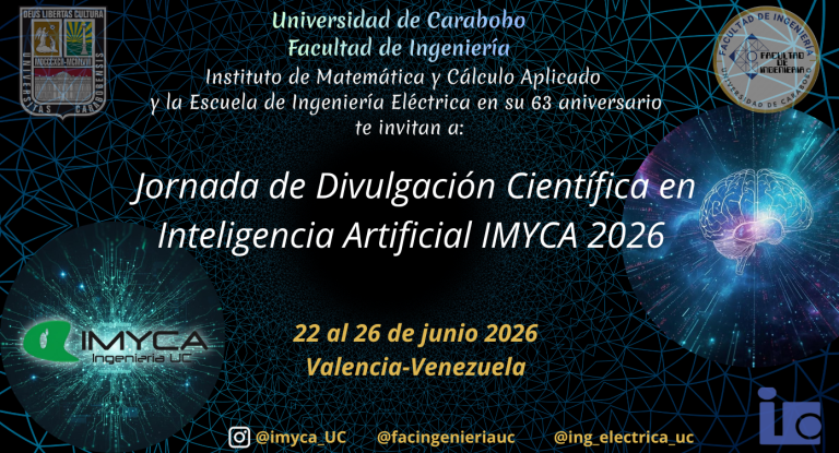 En el marco de la celebración histórica por su 63º aniversario, la Escuela de Ingeniería Eléctrica de la Universidad de Carabobo (UC) anunció la realización de las Jornadas de Divulgación Científica en Inteligencia Artificial, IMYCA 2026. El evento, que se llevará a cabo del 22 al 26 de junio, conmemora además el 50º aniversario del Instituto de Matemática y Cálculo Aplicado (IMYCA).