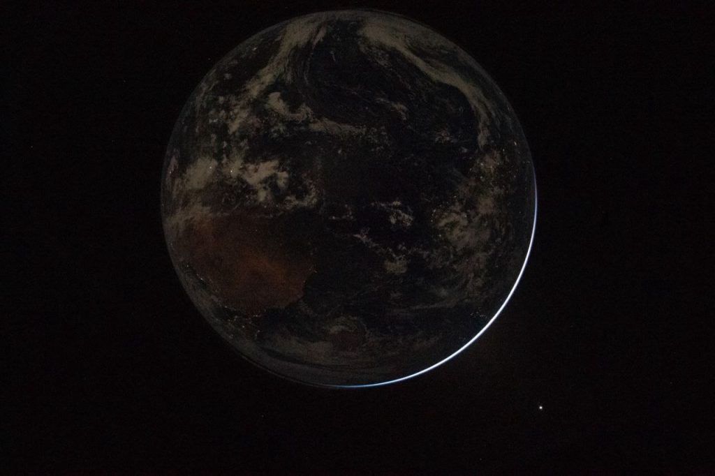 En esta última toma panorámica se logran identificar la masa continental africana y la península ibérica, al mismo tiempo que se distingue un leve resplandor verde en la zona septentrional producto de la aurora boreal, contrastando directamente con la negrura del espacio exterior.