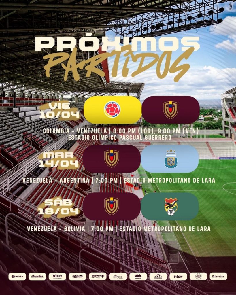 Para defender este liderato en la tabla, la plantilla nacional encarará un calendario de tres compromisos durante este mes, iniciando su itinerario el 10 de abril en condición de visitante frente a Colombia en el Estadio Olímpico Pascual Guerrero de Cali a las 9:00 p. m., hora de Venezuela.