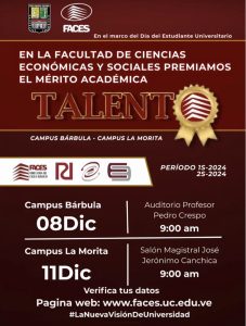 La Facultad de Ciencias Económicas y Sociales (FACES) de la Universidad de Carabobo (UC) ha organizado el acto de reconocimiento TALENTO FACES 2024, una iniciativa institucional