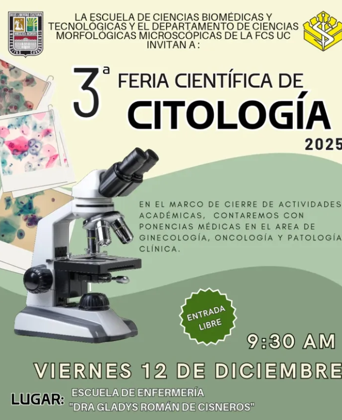 La Escuela de Ciencias Biomédicas y Tecnologías, junto al Departamento de Ciencias Morfológicas Microscópicas de la Facultad de Ciencias de la Salud de la Universidad de Carabobo, invita a la comunidad académica y profesional a la 3ª Feria Científica de Citología 2025. Este evento se realizará el viernes 12 de diciembre a las 9:30 a. m. […]