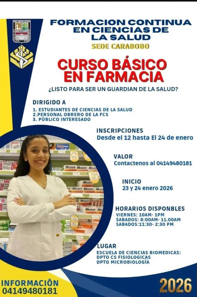 La Universidad de Carabobo, a través de su programa de Formación Continua, abre el proceso de inscripción para el Curso Básico en Farmacia en su sede Carabobo. Esta capacitación, dirigida a estudiantes de salud y al público general, recibirá postulaciones del 12 al 24 de enero. El programa busca formar nuevos «guardianes de la salud» […]
