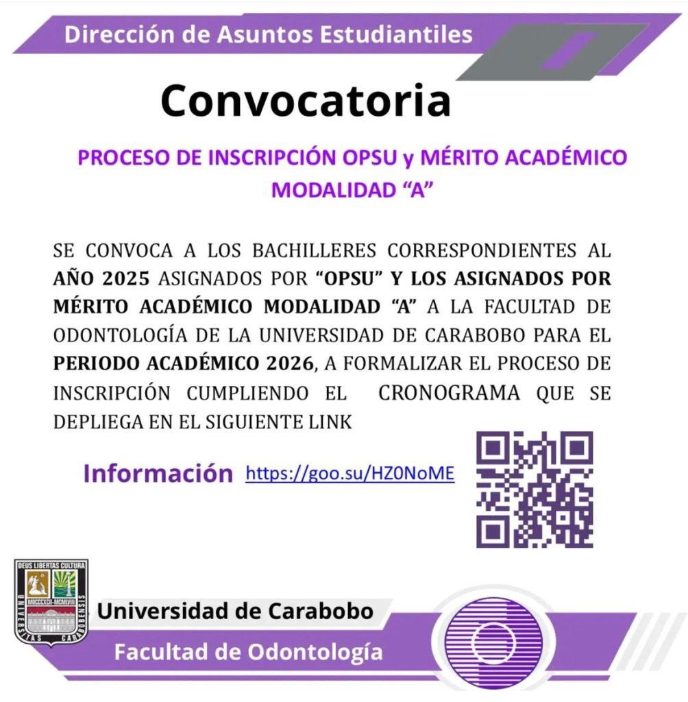 La Dirección de Asuntos Estudiantiles de la Facultad de Odontología de la Universidad de Carabobo ha emitido de manera oficial el llamado a inscripción para los bachilleres seleccionados que formarán parte de la nueva cohorte del periodo académico 2026. Esta convocatoria está dirigida específicamente a los estudiantes pertenecientes al año 2025 que han sido seleccionados […]